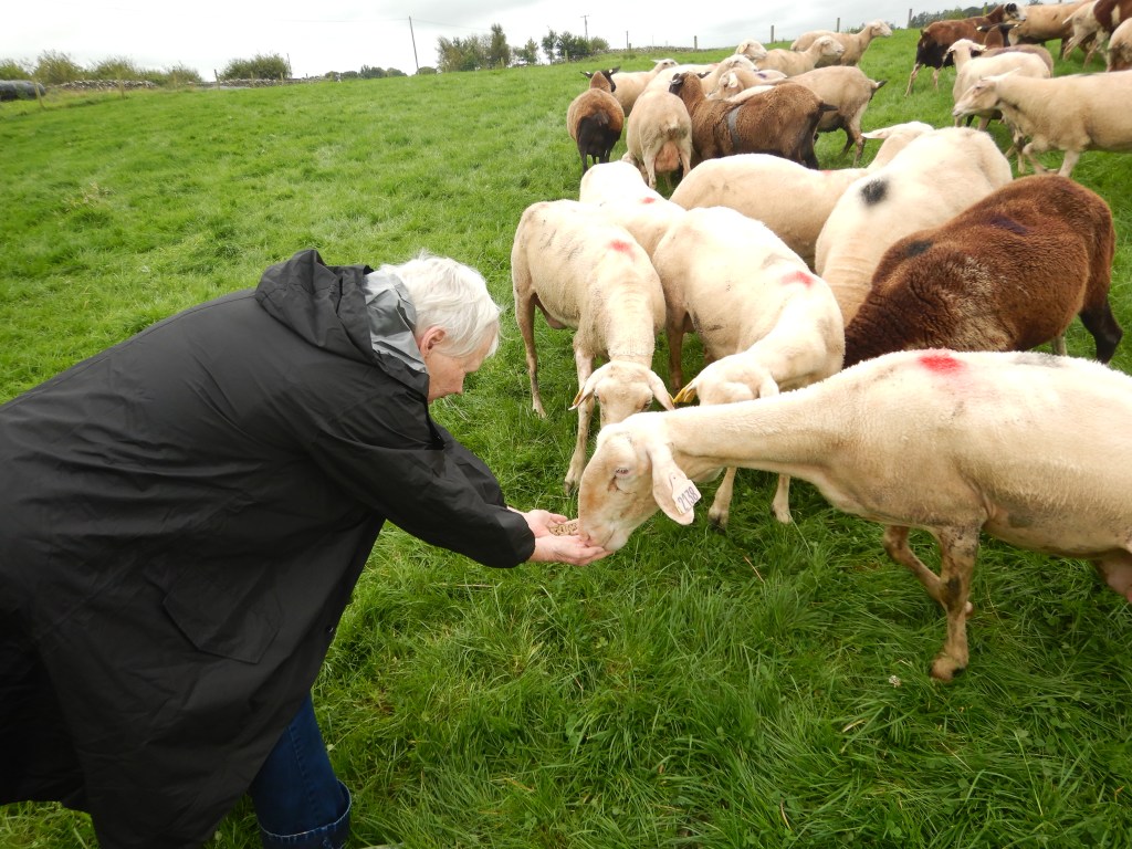 Up Saturday morning and back in the van for county Galway. Went to an oyster farm on Clew Bay, and then, oh, the eating of oysters! And the cakes and scones and more oysters. . . and about 45 minutes after that feast, we went to lunch. Of course we ate more! No one is surprised about that are you??? Then a tour of Velvet Cloud sheep farm, with — what else — more food! We tasted their sheep cheese and yogurt (the BEST yogurt!). My highlight was feeding the sheep — they were quite shy, but came running when our host poured some pellets on the ground; he gave me some in my hands and after a lot of hesitation, a couple of brave ones ate out of my hand, so softly delicate their mouths. More riding around Ireland (no direct route to destination because of various road closures) and we arrived late to Lisdonaugh Manor, where we’re staying for four nights. We have the whole manor house to ourselves and it is lovely, lovely. 9 bedrooms, drawing room, library, great kitchen, downstairs “den” — very swell! And now I have to go to class.
