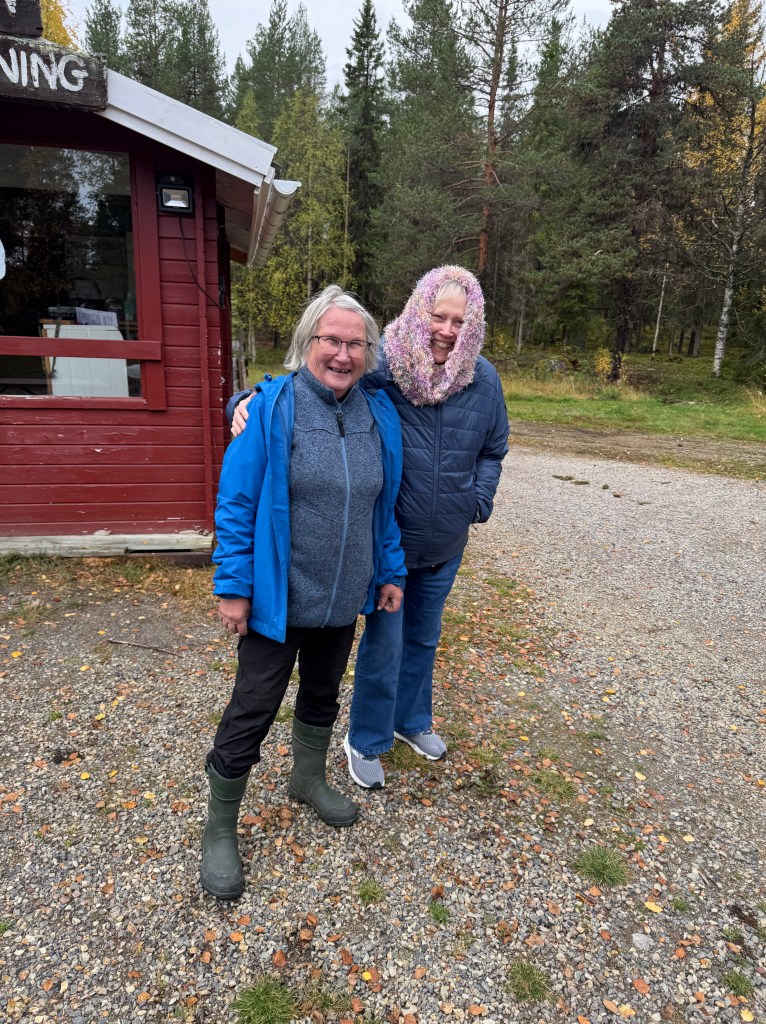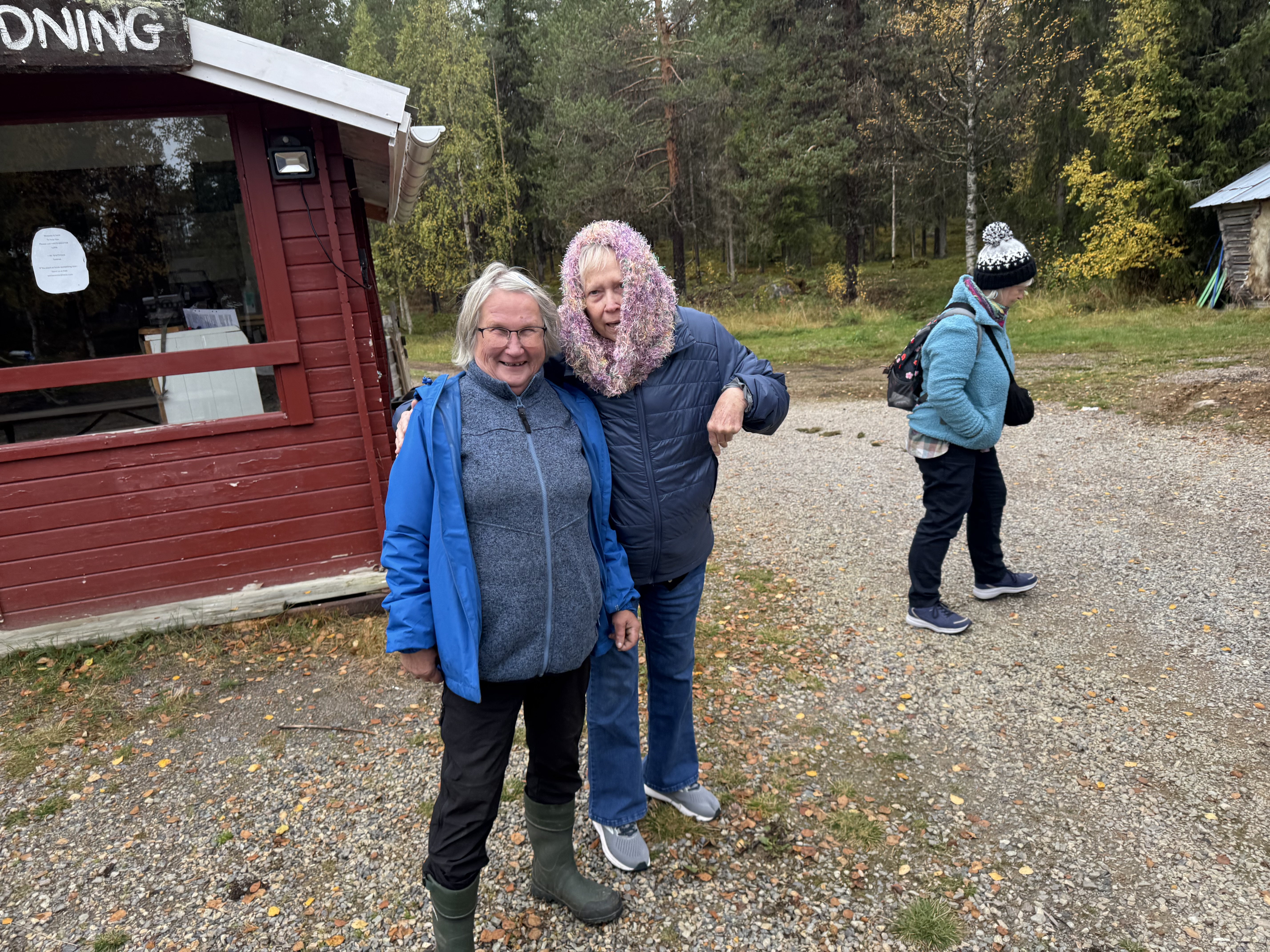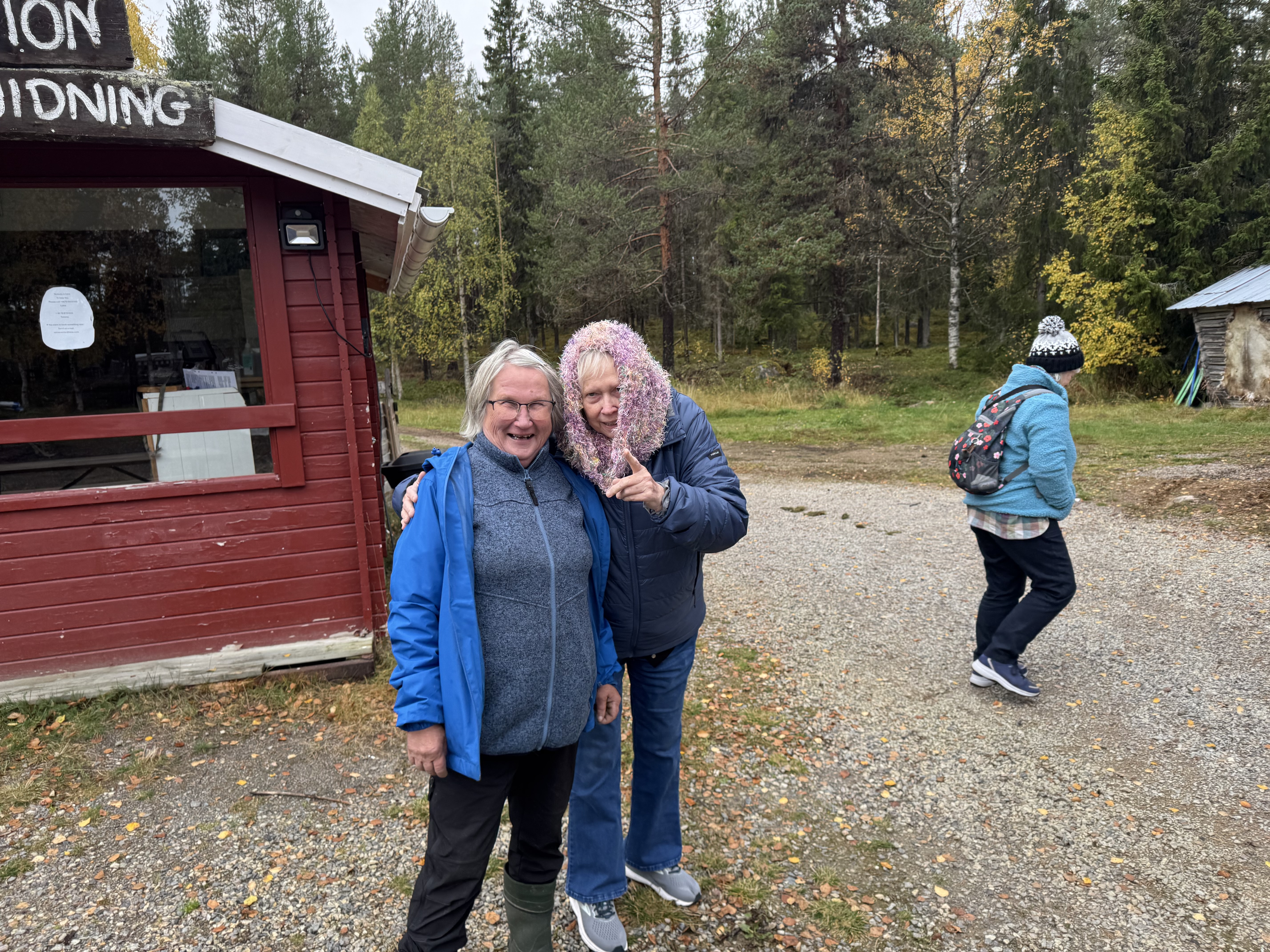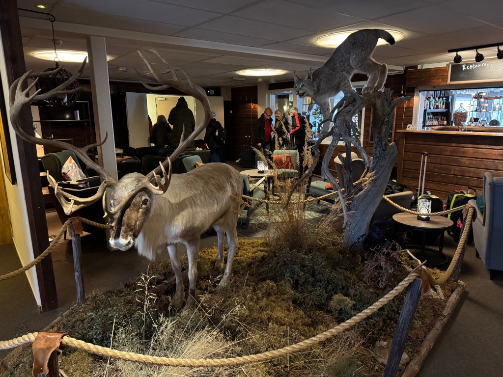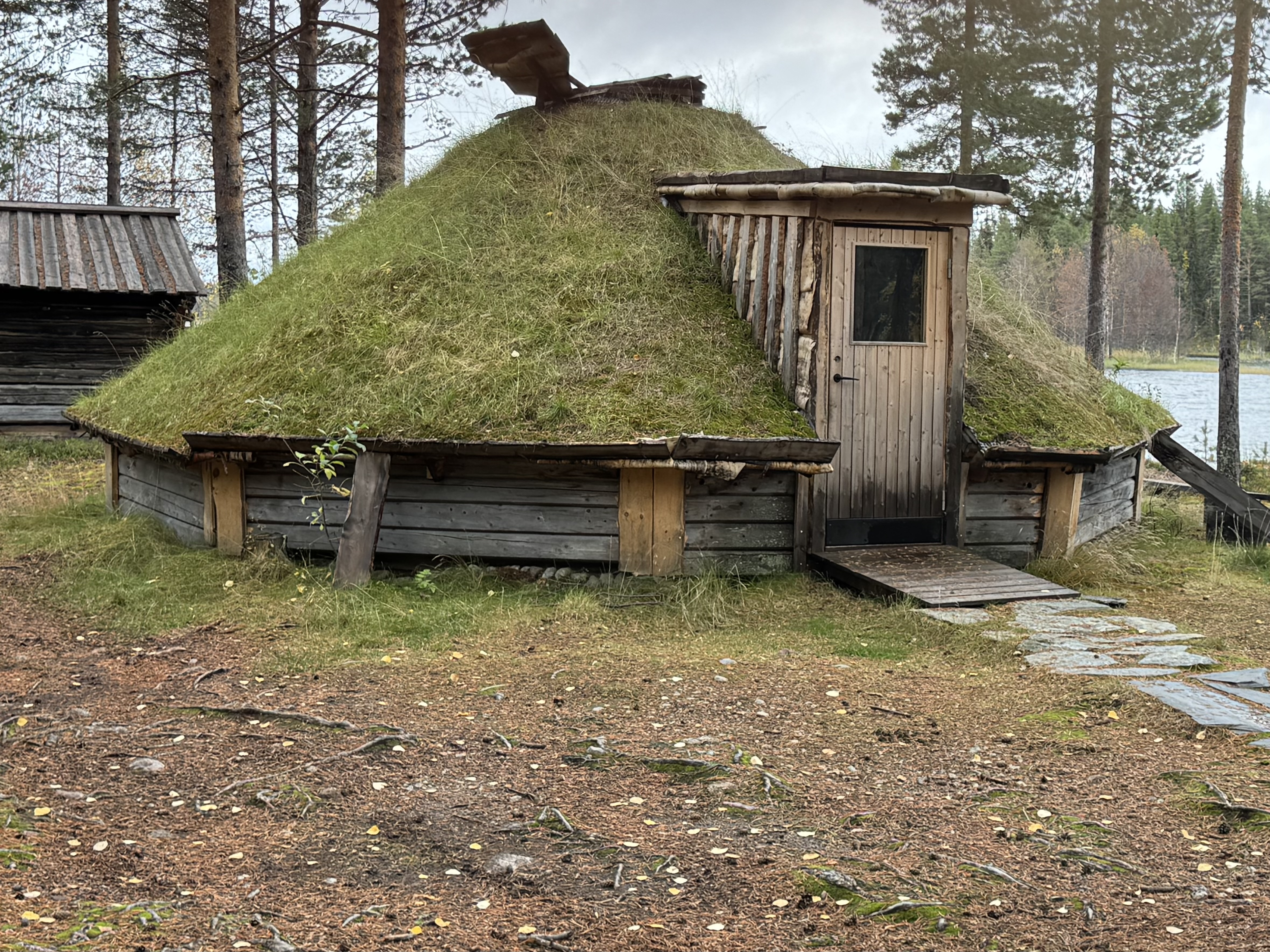Hello from the very cold north. We left Stockholm 3 days ago by train, all day to get to Oostersund, dinner, which I am sure was delicious but by now I don’t remember. Yesterday we started traveling by coach, the highlight being going to a Sami homestead on a lake — BTW, everything is on one or more lakes in Sweden; even living on the gulf of Mexico, I don’t feel like I’ve seen more water than there is in Sweden! Our guide, Lotta, is a small woman, definitely under 5′ and she had on green wellies that would fit a child. But she was funny and fun — assured us that they drove cars, lived in a house, used computers, slept in beds, etc. and then told us what life had been like when white Christians came to save the Sami — I saw on signs that they spell it Same, not Sami — it was the same story as for all Indigenous people. We have some Australians and one guy was saying that was how it was there and I said it was the same in US, even to the boarding schools and the beatings for speaking their language. Luckily, their language survived and is spoken today, even by school children. Lotta gave us the bad news that the reindeer weren’t around; it’s rutting season so they are off in the woods doing reindeer things. She and her husband have built several types of dwellings used by the Same by the river and gave us herbal tea that she assured would make us healthy and dried (but soft) reindeer and tiny little strips of dried (also sorta soft) pike — all was quite yummy. She took us into one dwelling that looked much like a hogan and told us about how life was lived in there. Her husband, whom she never named I don’t think, told us about herding. They have 2 alotments, one for winter and one for summer, only now they take the herd between them in trucks instead of herding them. After that we left and I can’t remember if we did anything else or just came to our next hotel, which we’ve been in for 2 days. While other folks were trying to squeeze into the elevator, Laird and I sat and had drinks — he a goldberry sour and I a forest gin — really good northern Swedish gin, really good tonic and whatever else, served with rosemary sprig and cucumber slices and peppercorns (I could do without the peppercorns, they just get stuck in the straw). We finally found our room; it took awhile because it is numbered 235 it’s on the elevator’s first floor (the European first floor — I thought only the British did that).