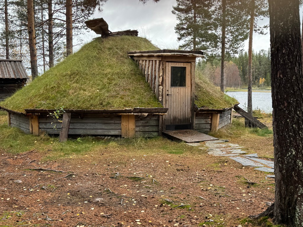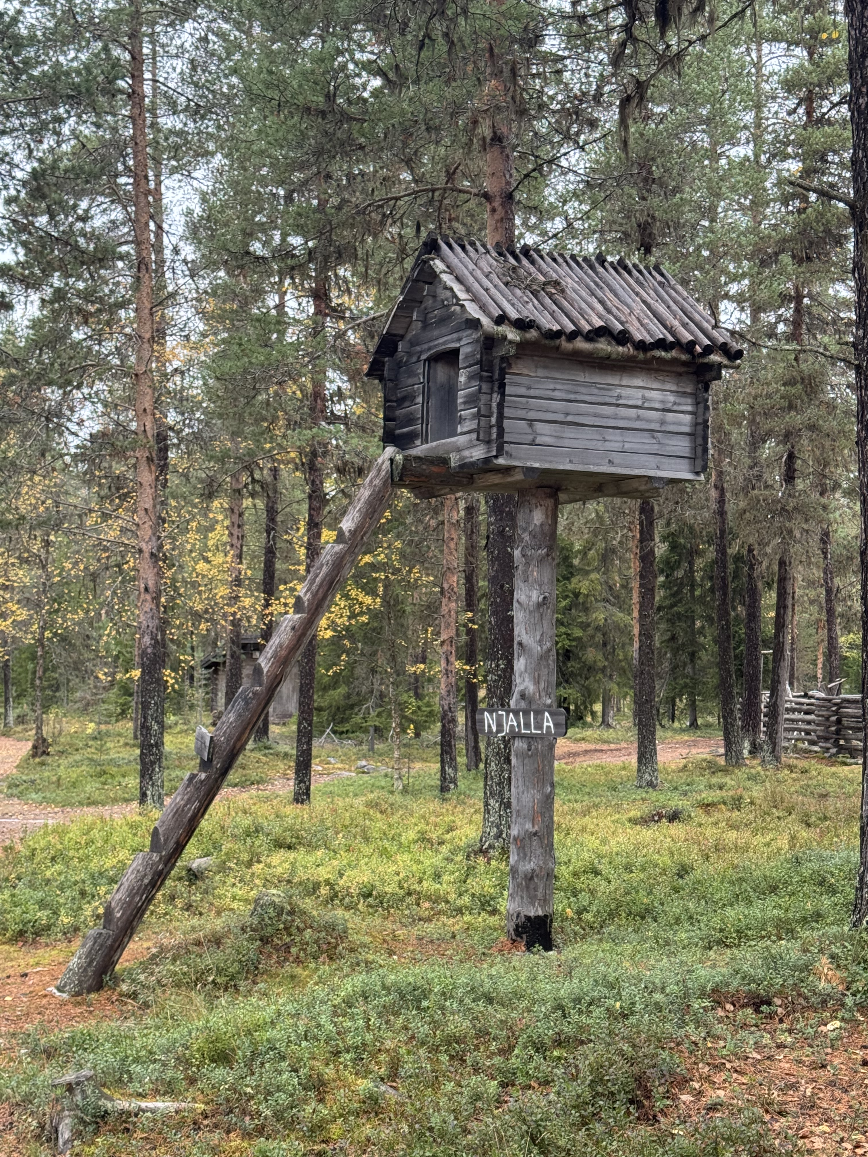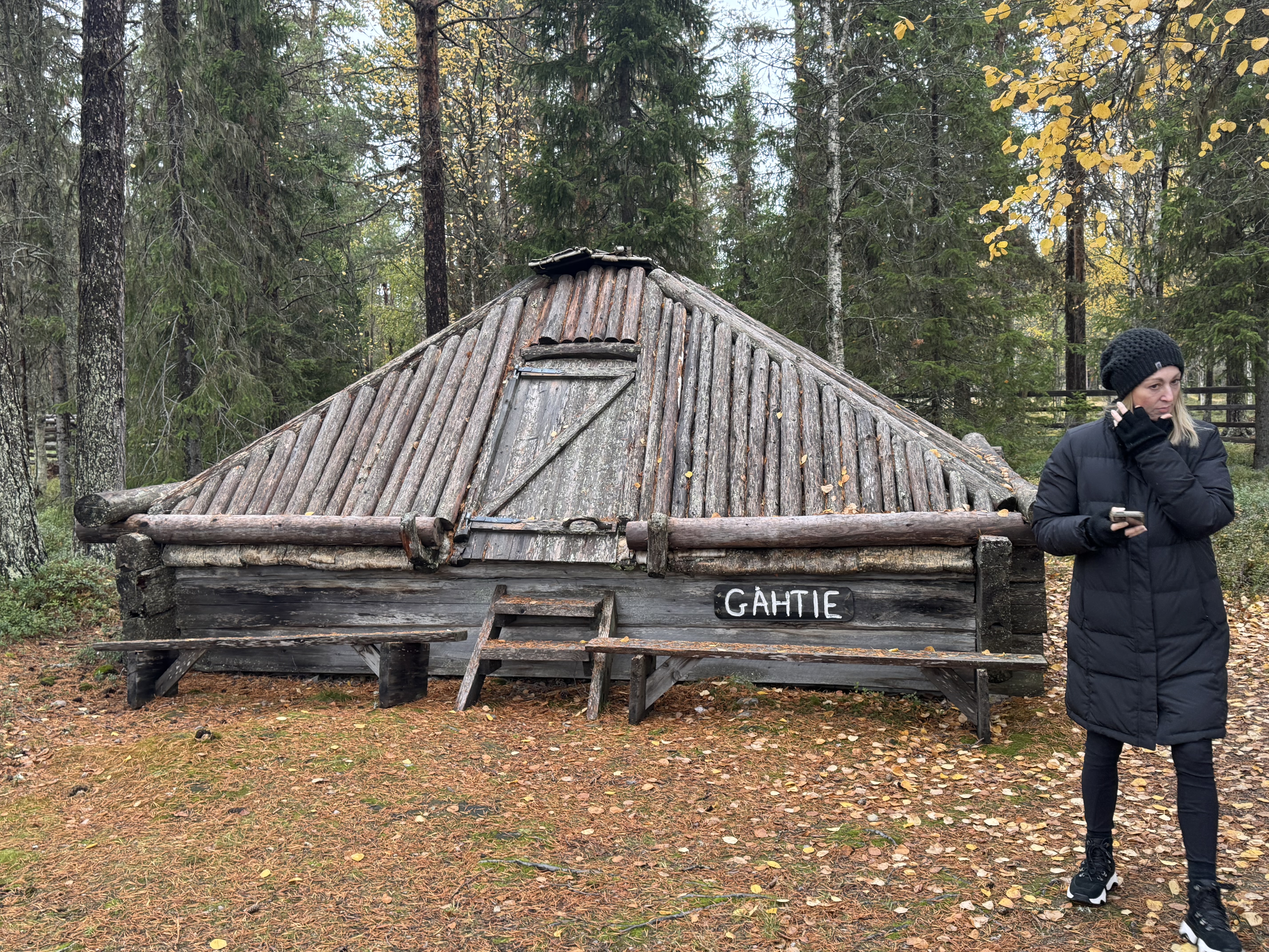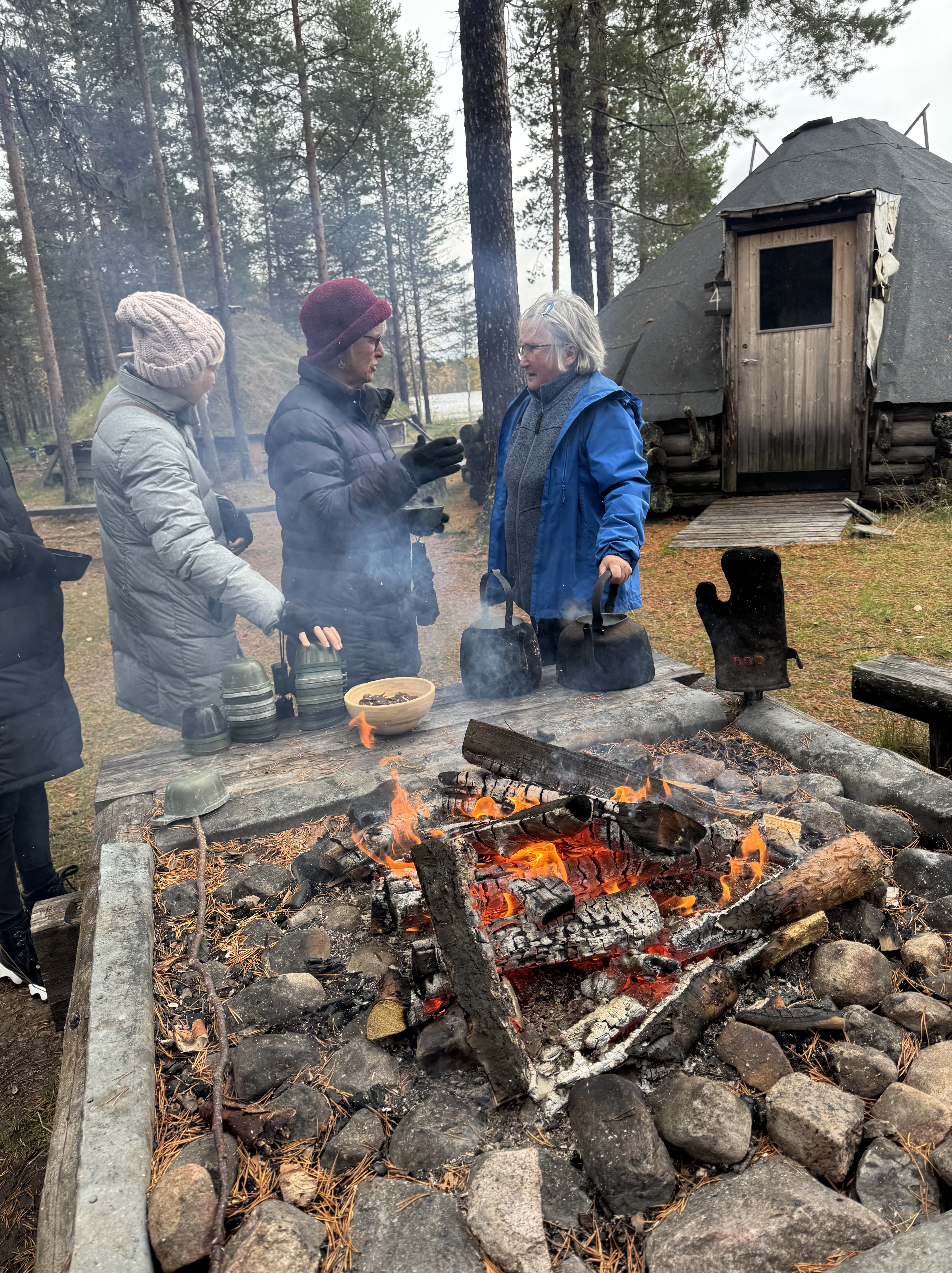 Hello from the very cold north. We left Stockholm 3 days ago by train, all day to get to Oostersund, dinner, which I am sure was delicious but by now I don’t remember. Yesterday we started traveling by coach, the highlight being going to a Sami homestead on a lake — BTW, everything is on one or more lakes in Sweden; even living on the gulf of Mexico, I don’t feel like I’ve seen more water than there is in Sweden! Our guide, Lotta, is a small woman, definitely under 5′ and she had on green wellies that would fit a child. But she was funny and fun — assured us that they drove cars, lived in a house, used computers, slept in beds, etc. and then told us what life had been like when white Christians came to save the Sami — I saw on signs that they spell it Same, not Sami — it was the same story as for all Indigenous people. We have some Australians and one guy was saying that was how it was there and I said it was the same in US, even to the boarding schools and the beatings for speaking their language. Luckily, their language survived and is spoken today, even by school children. Lotta gave us the bad news that the reindeer weren’t around; it’s rutting season so they are off in the woods doing reindeer things. She and her husband have built several types of dwellings used by the Same by the river and gave us herbal tea that she assured would make us healthy and dried (but soft) reindeer and tiny little strips of dried (also sorta soft) pike — all was quite yummy. She took us into one dwelling that looked much like a hogan and told us about how life was lived in there. Her husband, whom she never named I don’t think, told us about herding. They have 2 alotments, one for winter and one for summer, only now they take the herd between them in trucks instead of herding them. After that we left and I can’t remember if we did anything else or just came to our next hotel, which we’ve been in for 2 days. While other folks were trying to squeeze into the elevator, Laird and I sat and had drinks — he a goldberry sour and I a forest gin — really good northern Swedish gin, really good tonic and whatever else, served with rosemary sprig and cucumber slices and peppercorns (I could do without the peppercorns, they just get stuck in the straw). We finally found our room; it took awhile because it is numbered 235 it’s on the elevator’s first floor (the European first floor — I thought only the British did that).