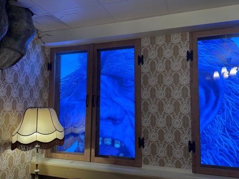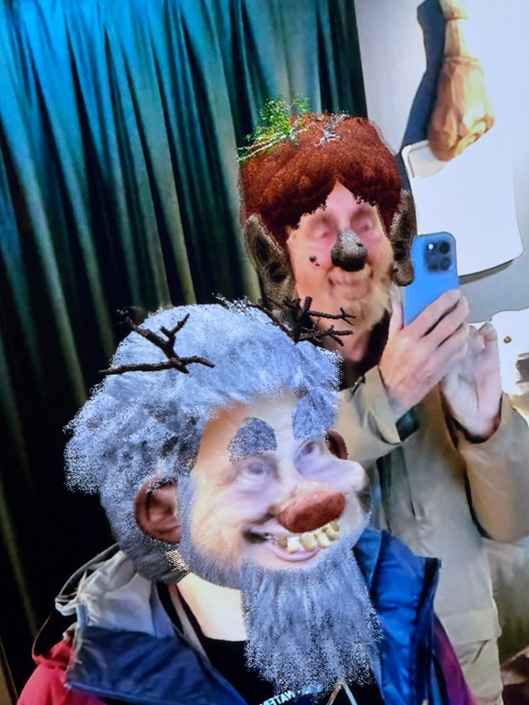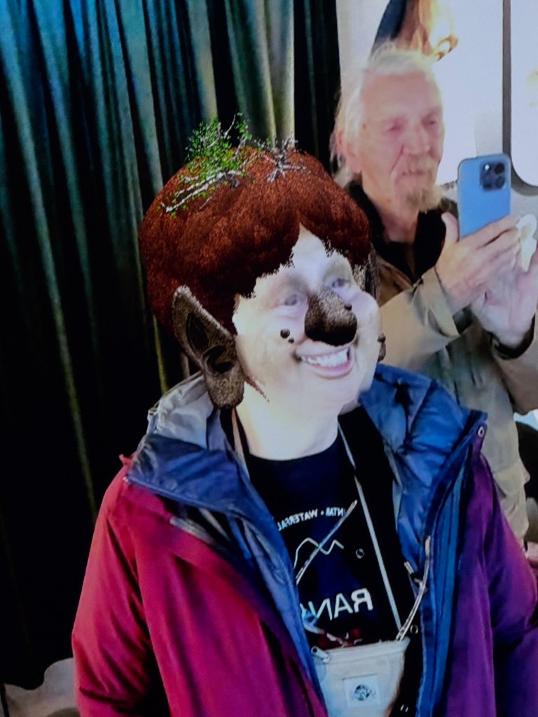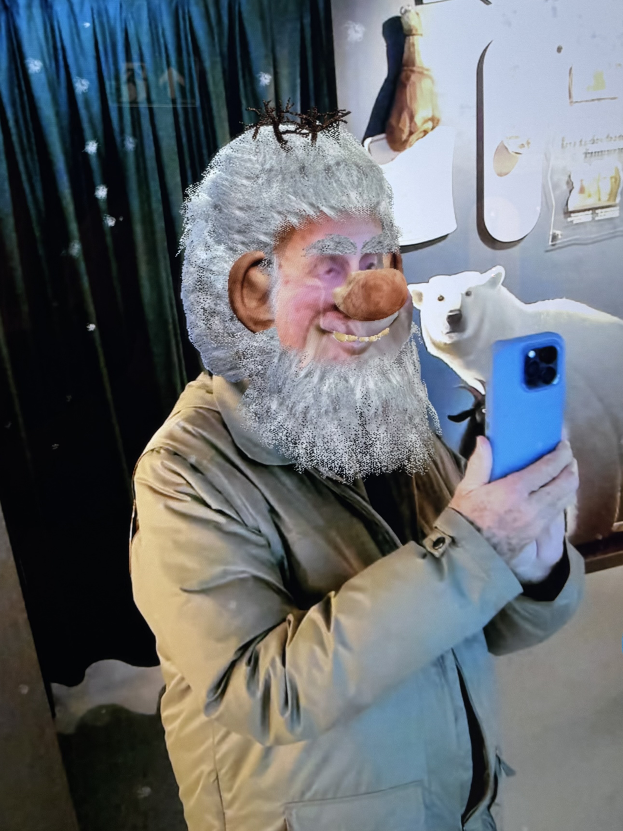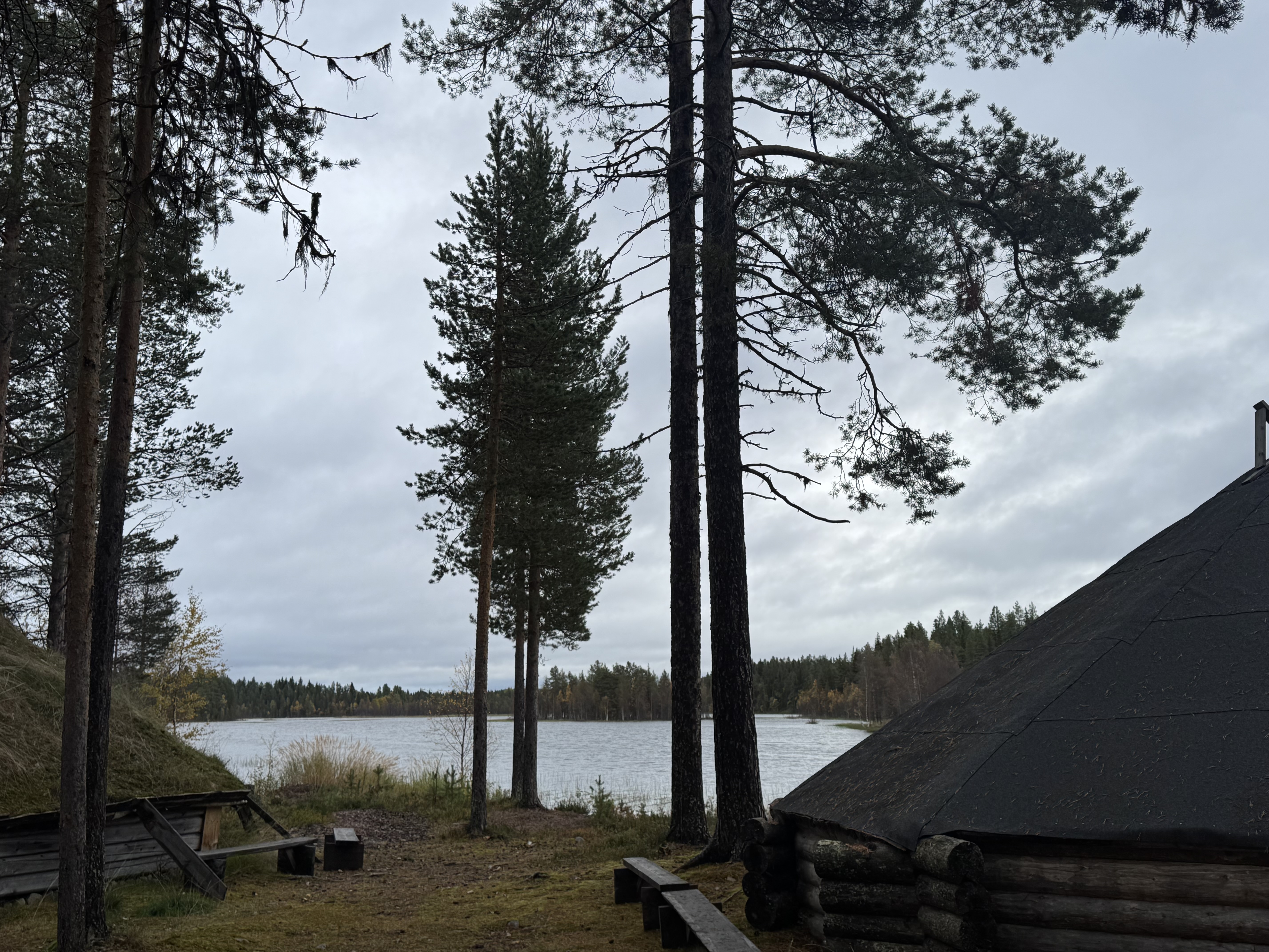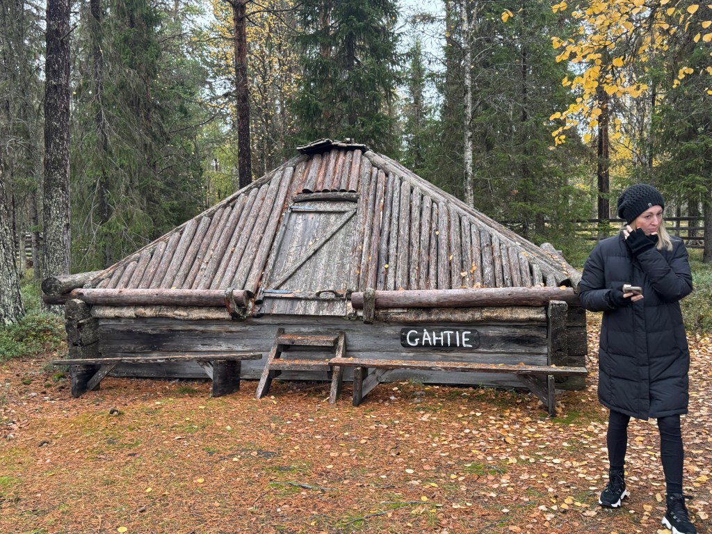 Hello from the very cold north. We left Stockholm 3 days ago by train, all day to get to Oostersund, dinner, which I am sure was delicious but by now I don’t remember. Yesterday we started traveling by coach, the highlight being going to a Sami homestead on a lake — BTW, everything is on one or more lakes in Sweden; even living on the gulf of Mexico, I don’t feel like I’ve seen more water than there is in Sweden! Our guide, Lotta, is a small woman, definitely under 5′ and she had on green wellies that would fit a child. But she was funny and fun — assured us that they drove cars, lived in a house, used computers, slept in beds, etc. and then told us what life had been like when white Christians came to save the Sami — I saw on signs that they spell it Same, not Sami — it was the same story as for all Indigenous people. We have some Australians and one guy was saying that was how it was there and I said it was the same in US, even to the boarding schools and the beatings for speaking their language. Luckily, their language survived and is spoken today, even by school children. Lotta gave us the bad news that the reindeer weren’t around; it’s rutting season so they are off in the woods doing reindeer things. She and her husband have built several types of dwellings used by the Same by the river and gave us herbal tea that she assured would make us healthy and dried (but soft) reindeer and tiny little strips of dried (also sorta soft) pike — all was quite yummy. She took us into one dwelling that looked much like a hogan and told us about how life was lived in there. Her husband, whom she never named I don’t think, told us about herding. They have 2 alotments, one for winter and one for summer, only now they take the herd between them in trucks instead of herding them. After that we left and I can’t remember if we did anything else or just came to our next hotel, which we’ve been in for 2 days. While other folks were trying to squeeze into the elevator, Laird and I sat and had drinks — he a goldberry sour and I a forest gin — really good northern Swedish gin, really good tonic and whatever else, served with rosemary sprig and cucumber slices and peppercorns (I could do without the peppercorns, they just get stuck in the straw). We finally found our room; it took awhile because it is numbered 235 it’s on the elevator’s first floor (the European first floor — I thought only the British did that).