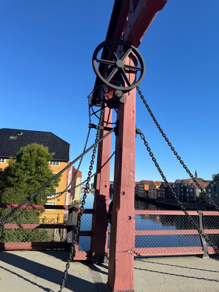 We went through more and more spectacular landscape, left the north and coming south, were farms, cows, cabbages and whatever else. It felt like we were driving through the food basket of Norway. We had a lovely, scenic detour of about 1/2-1 hour with more stunning landscape, then connected back to the highway we wanted and on Into Trondheim, homeland and capital of the Vikings. On the Tronheim fjord. There is a river that meanders through the town past 1,000 years of history. — spelled Nideiva, no idea how it’s called.