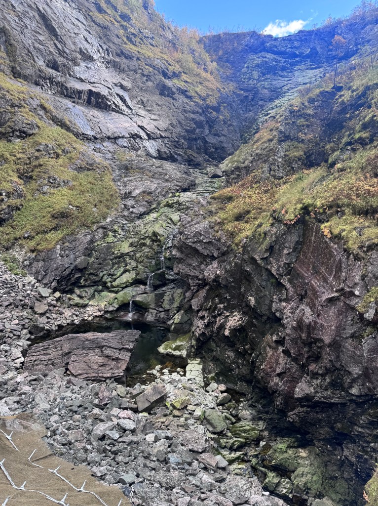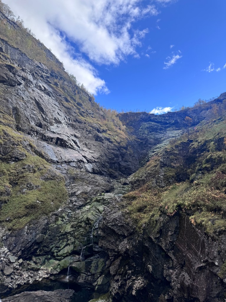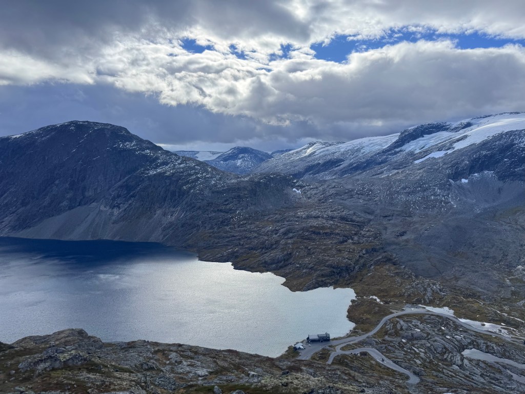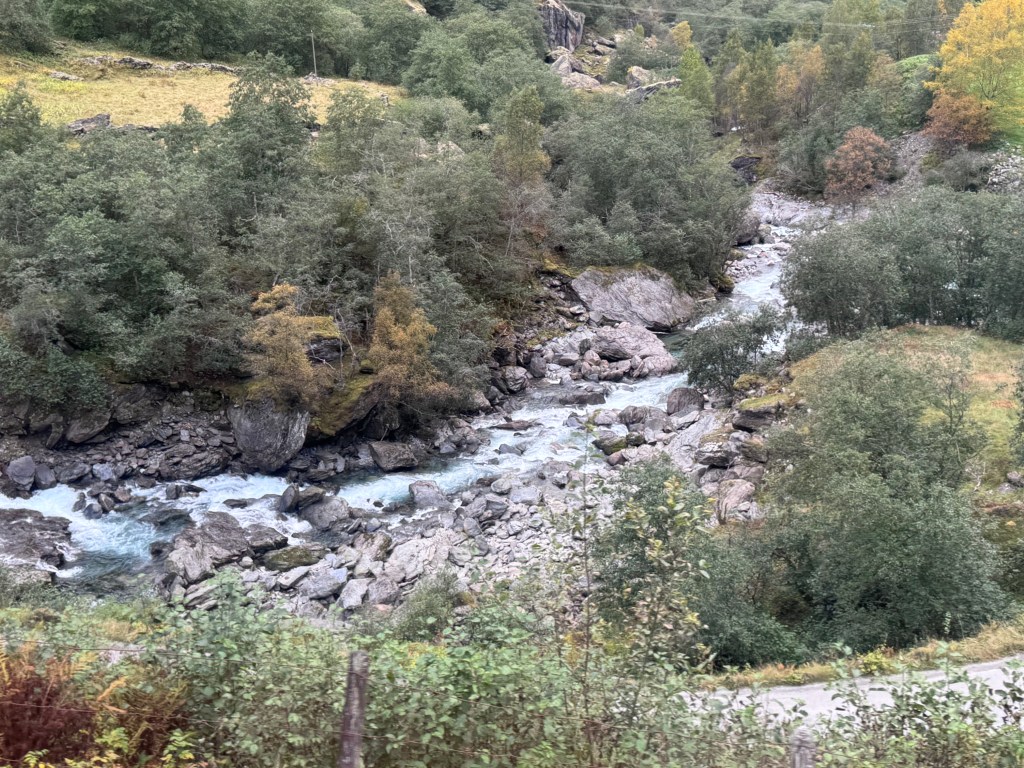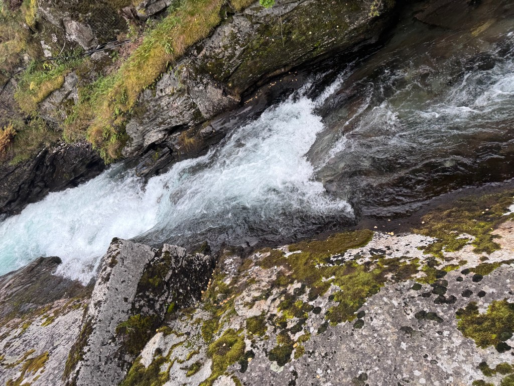 Monday, we took the ferry, about an hour, to Hellesvlt and then on the bus for more slack-jawed awe as we traveled (a long way) through mountains and up another hairpinny road to skywalk — it was bitterly cold as we exited the bus, felt like 40 below with the meanest wind trying to blow us off the platform! We worried about a little dog whose owner kept dragging it nearer the edge, which it, smartly, did not want to get anywhere near. If she had lost hold of the leash, I am sure the wind would have picked it up and hurled it into space. Going down, another time that was not a picnic. There were lots of places like that all over the place. Luckily, well sorta, was going back down into Geiranger we took a slightly less heart attack road than the original one.