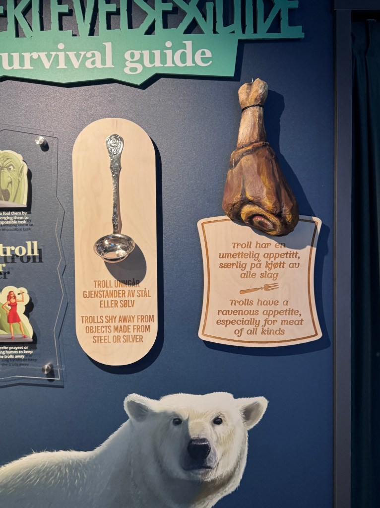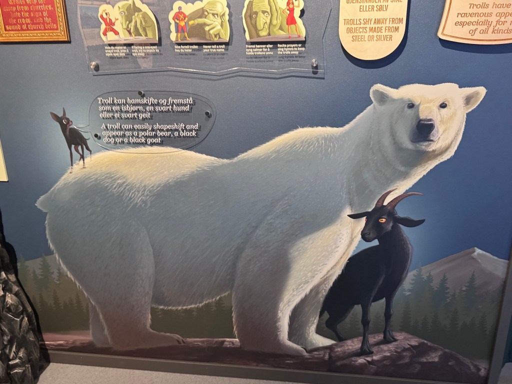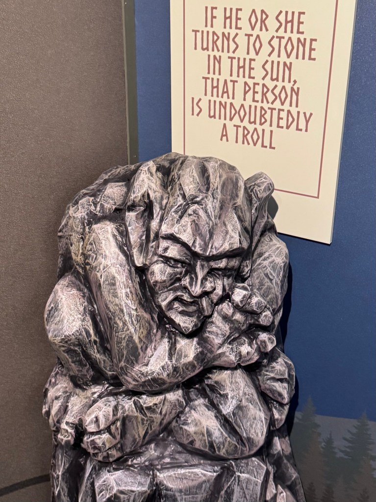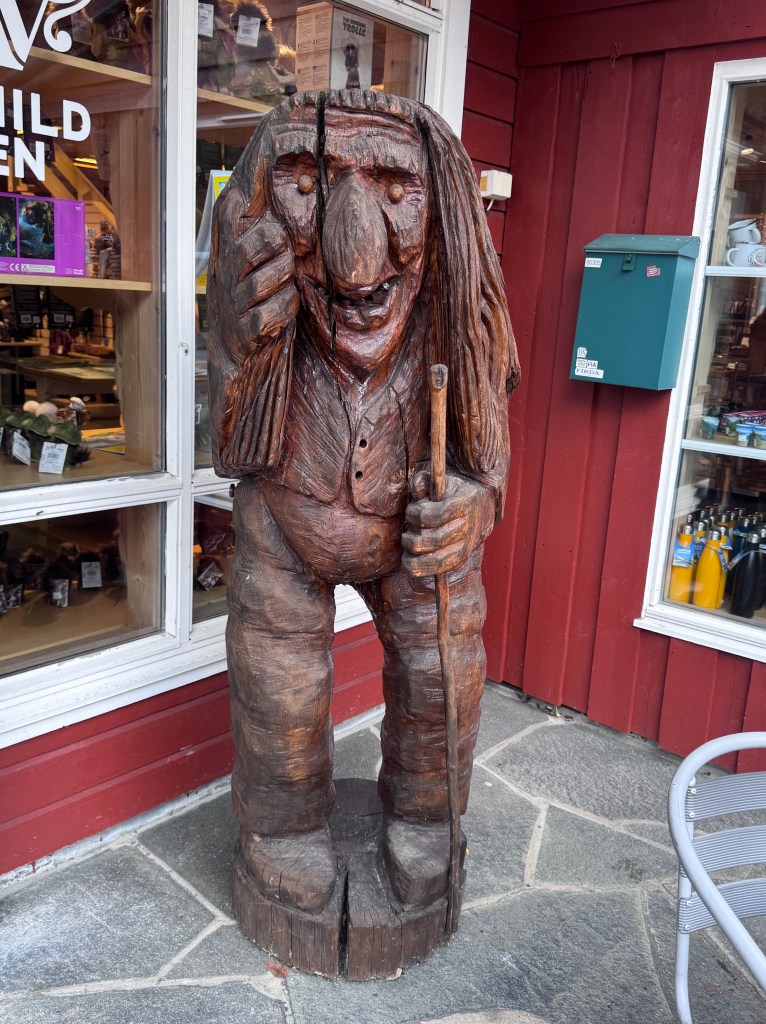 The newest museum in Bergen, the troll museum, was fantastic — everything you ever wanted to know about trolls, hulders, neisse and other critters in folklore. You learn that trolls are huge guys, with tails and 1-3 or 4 heads (think I already told you some of this) — they are definitely meat eaters, including sheep, cows and…humans. They particularly like young women, but that is a tale that can get ickky pretty quickly. They only come out at night because the sun makes them explode and turn into rock — so just think about what I had to say about all the rocks in Norway…. In one room, an oldfashioned living room with a TV from the early 50s, there is a troll outside the picture window looking for a way in — very noisy about his frustration. There are different types of Neisse (I think that is the spelling), there are house ones and barn ones and whatever else. They are very helpful to their owners who are kind to them and they look forward to their christmas present they get each year. One story has a very eager barn neisse that takes care of the horses, and does all the work of feeding, watering, unhitching them from the buggies back from trips to town and putting them up for the night. He was so good and so eager to please that come christmas time, the farmer got him a present of leather pants, which he gave him with much fanfare. The neisse was ecstatic with his new pants! He put them on and didn’t take them off. The farmer and his family went to church on christmas day and when they got back, the farmer just dropped the reins and everyone went into the house as usual. Much, much later, the farmer looked out and saw the horses still standing there in the dooryard, still hitched to the buggy. Out the farmer came, stomping angrily towards the barn, yelling for the neisse, who was standing in the door in lhis new leather pants, smiling up at the moon. “Why have you not put up the horses?! Cried the farmer. The neisse just stood there with his fingers in the belt loops of his new leather pants, smiling. “What”, he replied, “and ruin my new pants?”