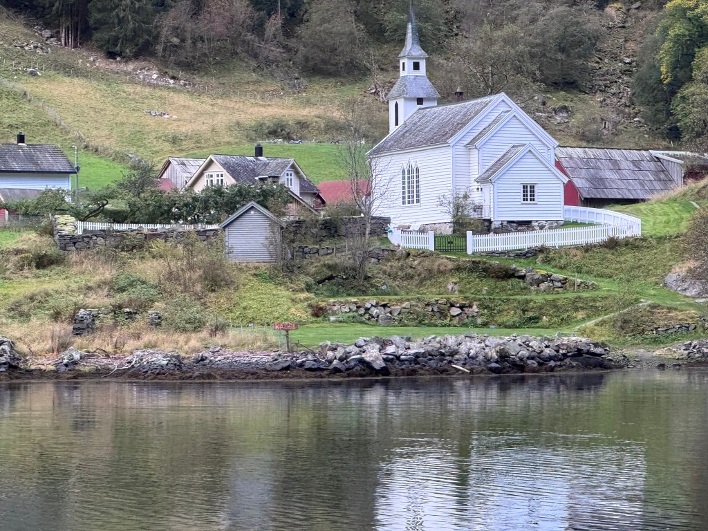 After 2 nights in Geiranger (ghear-anger, sort of), we got on the bus to Flam (accent mark, of course, the little empty circle above the a). Stopped at 12th century Kaupanger Stave Church — gorgeous, and our guide, whose name was Judith, pronounced Yudith, sang for us; she was quite wonderful, even though I couldn’t really hear what she had to say, or sing, either. Then on to a christmas shop. The shop owner was very funny and sure loved to laugh. I still want a reindeer rug, but no one will ship to the US. We took another ferry to Flam and had a nice hotel.