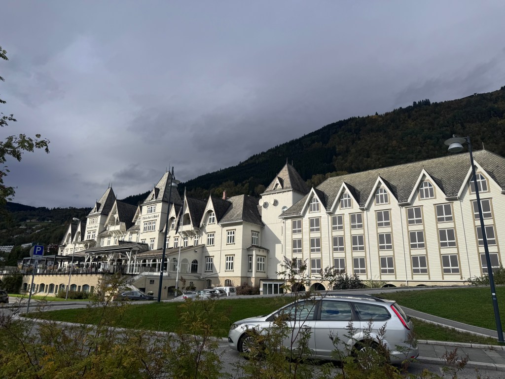 We are in Norway, spent night before last in Bodo (with some diacritical mark somewhere), largest significant Norwegian city north of the Arctic circle. We went to the Salmon Centre to learn about salmon farming — quite interesting, though by this point in whole tour I was in deep abiding pain, so hard to really, really appreciate — so I have just made a habit of eating salmon at every meal. Laird and others went to the Jekt trade museum and I and a couple of other people waited on the bus. On to our hotel — pretty long day on bus. But not like the next day!