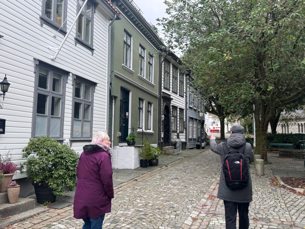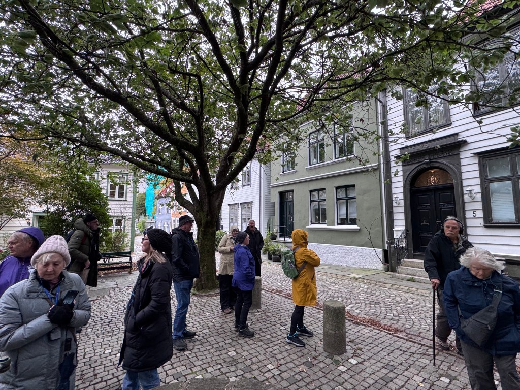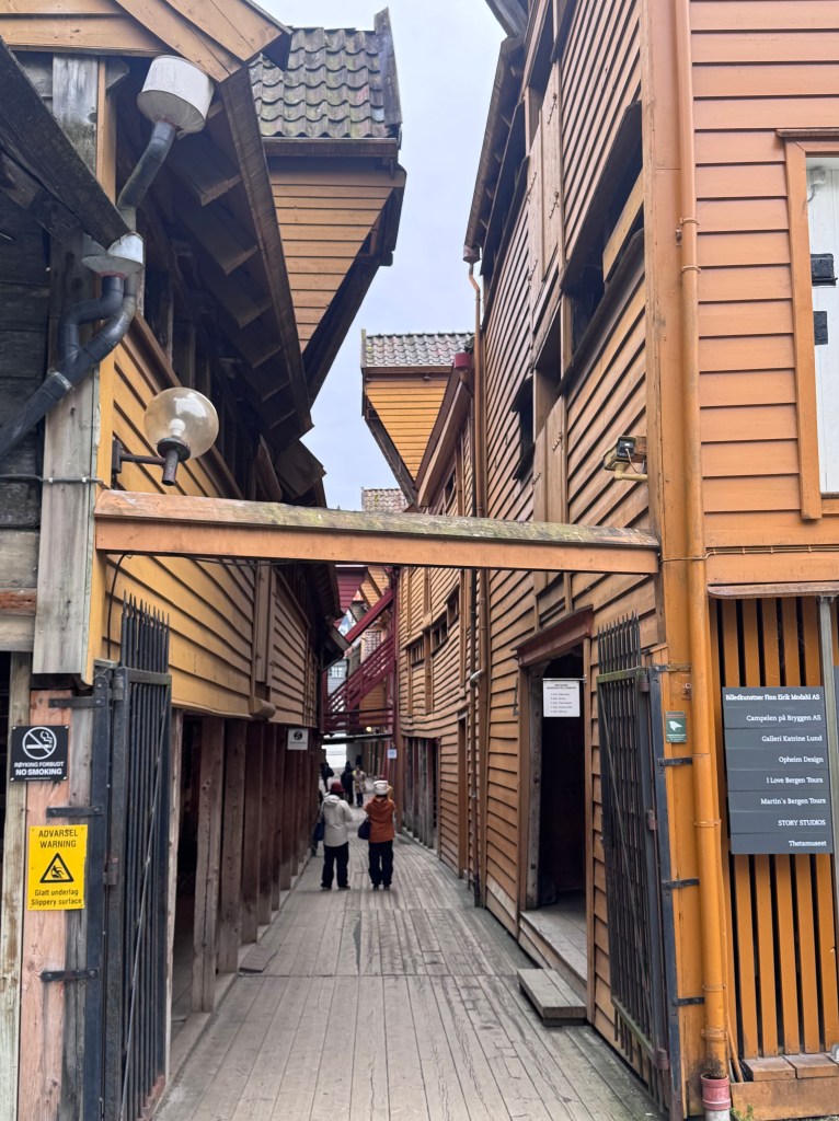 The bus driver, Vitaly, told us that it rains every other day in Bergen. So, it rained on walking tour day. Not RAIN, just that annoying kind that you can’t really see and you keep telling yourself you aren’t getting wet. We were. Bergen is beautiful (of course, how not???) and the walking/busing tour was interesting. Our hotel was near the harbor and old town — though apparently old town for residents is much further away. I don’t understand any of that, but what we saw would have been even older if it hadn’t been for all the fires that happened in a town of wooden houses. The 1834 fire burned over 400 residences. Some neighborhoods were still old by US standards. Here’s something we learned: the rich people back then painted their houses white because it was the most expensive paint. The poor people painted their houses red because that was the cheapest paint. The rest of them painted them all the other colors, mustard yellow being a favorite. I love the architecture in Bergen — in most of Norway; it was less interesting the closer we got to Oslo, but by the time we got here, it was pitch black dark so can’t tell what it looks like here. We learned other stuff, but that’s all I can remember right now after a 2-hour bus ride back to Voss and then a 7-hour train ride to Oslo. Like almost all historic areas, there are lots of warren-like narrow streets and alleys and houses cheek by jowl or higgledy-piggledy. Very picturesque, but it would be living with five neighbors staring into your bedroom from five different directions.