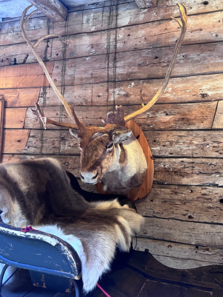 Today we went to the arctic circle, jumped, well hopped, over a bit of red rope and got our certificates. We did see a small reindeer group on the side of the road going and I later saw a young buck on our side of the bus. Then we went to Jokkmook (sp?) to a really good museum about the Sampi (another spelling) — they did a really great job, but too many explanations had other languages, but not English. Lunch in the museum cafe was excellent. Then we came back and I wrote this down. Oh, and we saw more reindeer on the way back. I really want a reindeer hide, but, alas, they are heavy. Maybe I’ll figure out a solution — or maybe not.