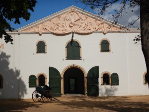 On Tuesday, we went to Grot Constancia, the oldest winery in South Africa. Oh, the museum building is the most beautiful Cape Dutch I’ve seen — even better than what I think that house in Wilderness might look like (and I LOVE that house!) So much yellowwood, which mostly doesn’t exist anymore, or at least not in any quantity, certainly not commercial quantity — though we did buy a small (as it’s very young) yellowwood tree for our friends — though it will take a couple of hundred years for it to get impressive. Anyway, what a lovely, lovely house, built sometime in the 1650s, I think. Part of it, mostly the roof and the furniture burned up in 1925. The whole winery belongs to the government and someone leases the vineyard and wine production facilities. We went on the winemaking tour and then had the wine tasting — VERY good wine! If you ever see it, buy it (though I don’t think it is exported to the US). That building has a beautiful art collection. Our lunch was Cape Malay, an assortment of curries, in another impressively wonderful building. While we waited for our taxi driver to come get us (a very nice man from Congo by the name of Bled — all three of our taxi drivers in Cape Town were from Congo), we thought we would freeze — the day turned bitterly cold and we were dressed more for summer. Yes, yes, we know the CT weather changes rapidly, but we underestimated the time it would take Bled to get to us. While waiting, Marita saw a man with a gun and asked what he was doing. He said he was off to shoot baboons. We were horrified. He came back relatively soon after and I looked at his weapon; it didn’t look like any gun I had ever seen so I asked him about it. It is a paintball gun that they use to scare the baboons away, not kill them. We immediately felt much better! The critters apparently eat the new leaves emerging on the grape vines, which significantly cuts down on the grape crop.