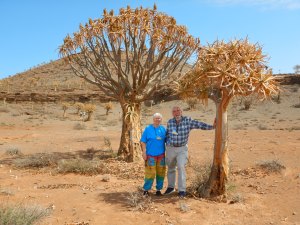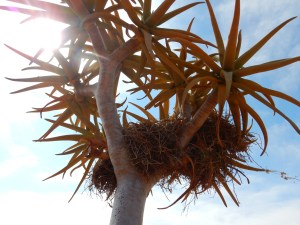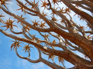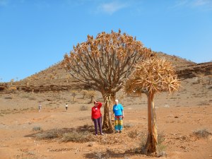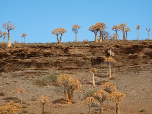 On Saturday, we went to a quiver tree forest — google them, too.  Amazing sight, even though they had already bloomed and were in “shut-down” mode.  They are tree aloes and I SO want one!  Sandy, you will, too, when you see them!  They are named quiver trees because the Khoi-san made arrow quivers from them because without their water, they weigh almost nothing.  Interesting thing about them:  when the summer is intolerably hot and they have used up almost all their water reserves, they amputate their own arms to conserve what little water they still have.  Isn’t that gruesome?  Baboons, the bane of flora and farmers all over South Africa, like to eat quiver trees for their water.  Namaqualand is definitely a dog-eat-dog world!