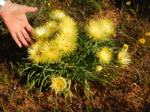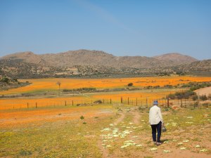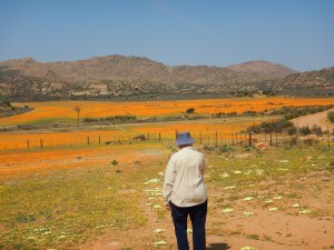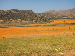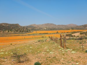 YES!  Those great swaths of orange or yellow or white that you see when you google Namaqualand flowers are real.  We didn’t see them until Sunday, but when we did, we stood in awe and our hearts soared at the sights!  Friday and Saturday, we saw mostly very tiny flowers spread out.  The land is unbelievably inhospitable in the summer — temperatures in excess of 115 F!  And NO rain.  Only winter rains, and if it doesn’t rain enough then, the flowers don’t open come spring.  The annual rainfall is about two and one-half inches of rain a year — or that’s what we think they said.  Yikes!  Makes New Mexico look like the tropics!  Actually, there is a similarity in landscape except even with so little rain there are more bushes, but virtually no trees.  For all of you folks on Facebook, go to Toere Namakwa to see beautiful pictures while you’re waiting for us to post.  If you aren’t on Facebook, you can go without having an account by, I believe, going to http://www.facebook.com/toerenamakwa (not sure if that is one or two words; try both.  Also try namakwatoere (again one or two) if the other doesn’t work.  It’s well worth the effort.